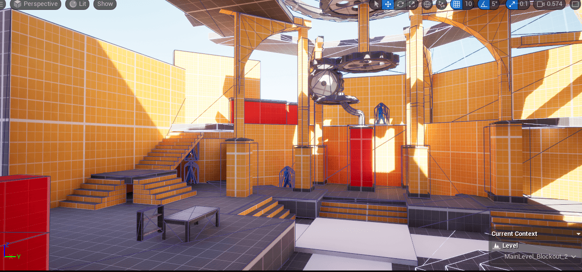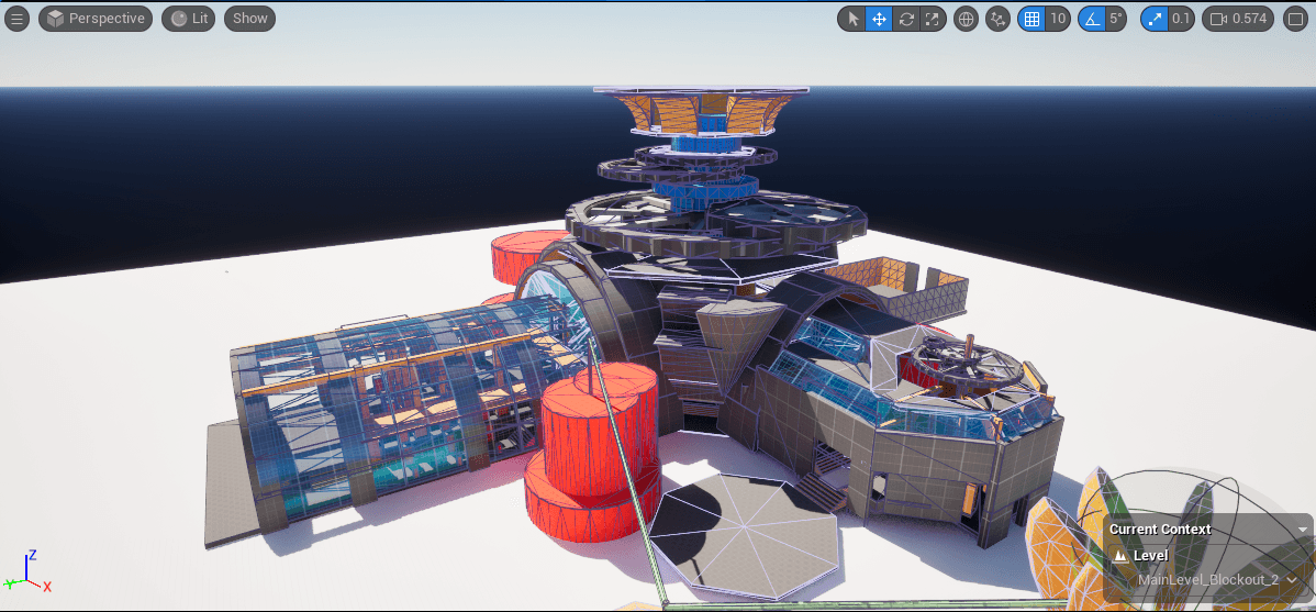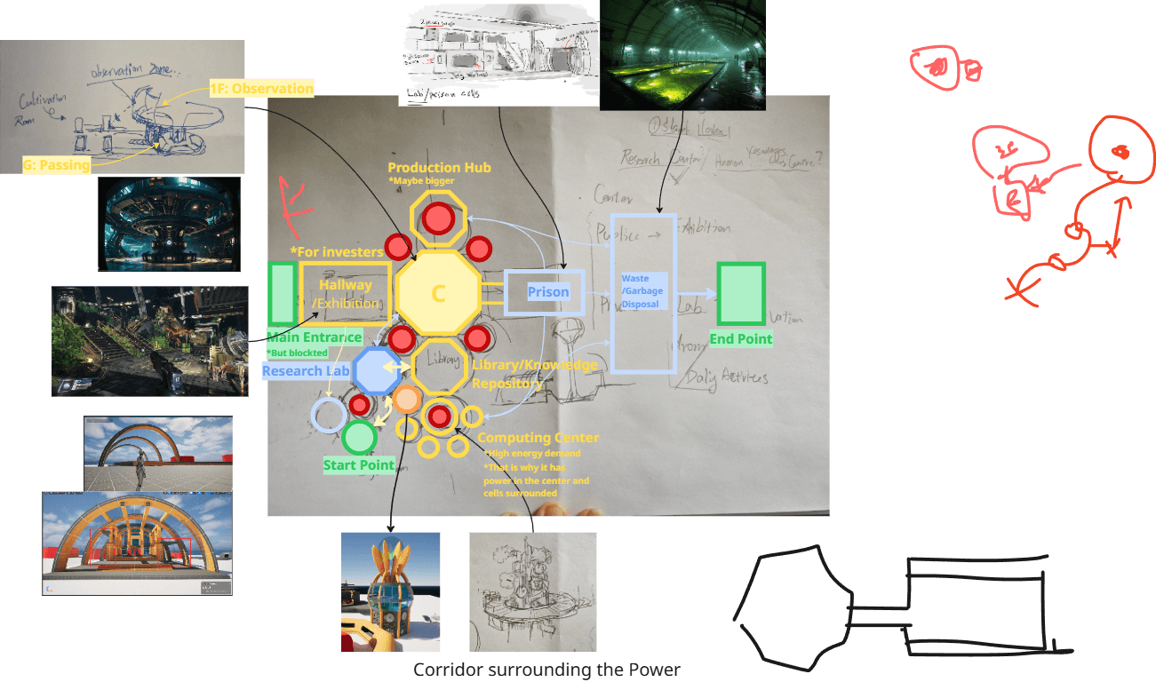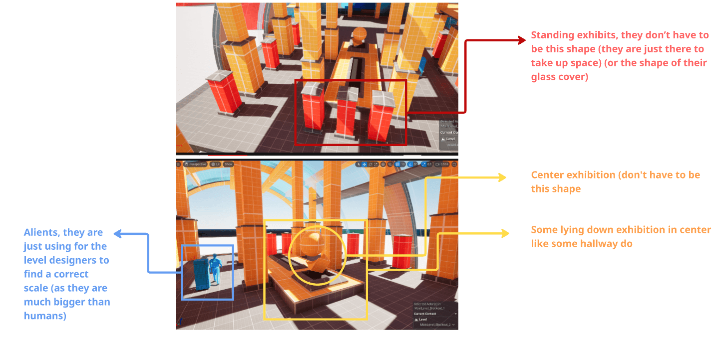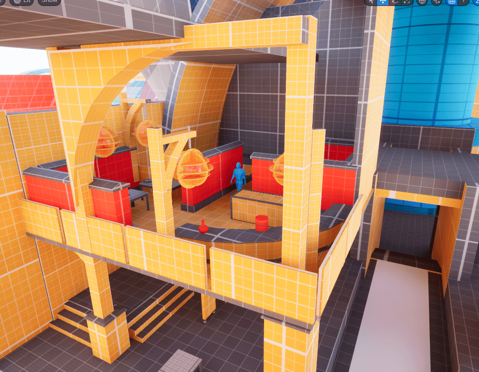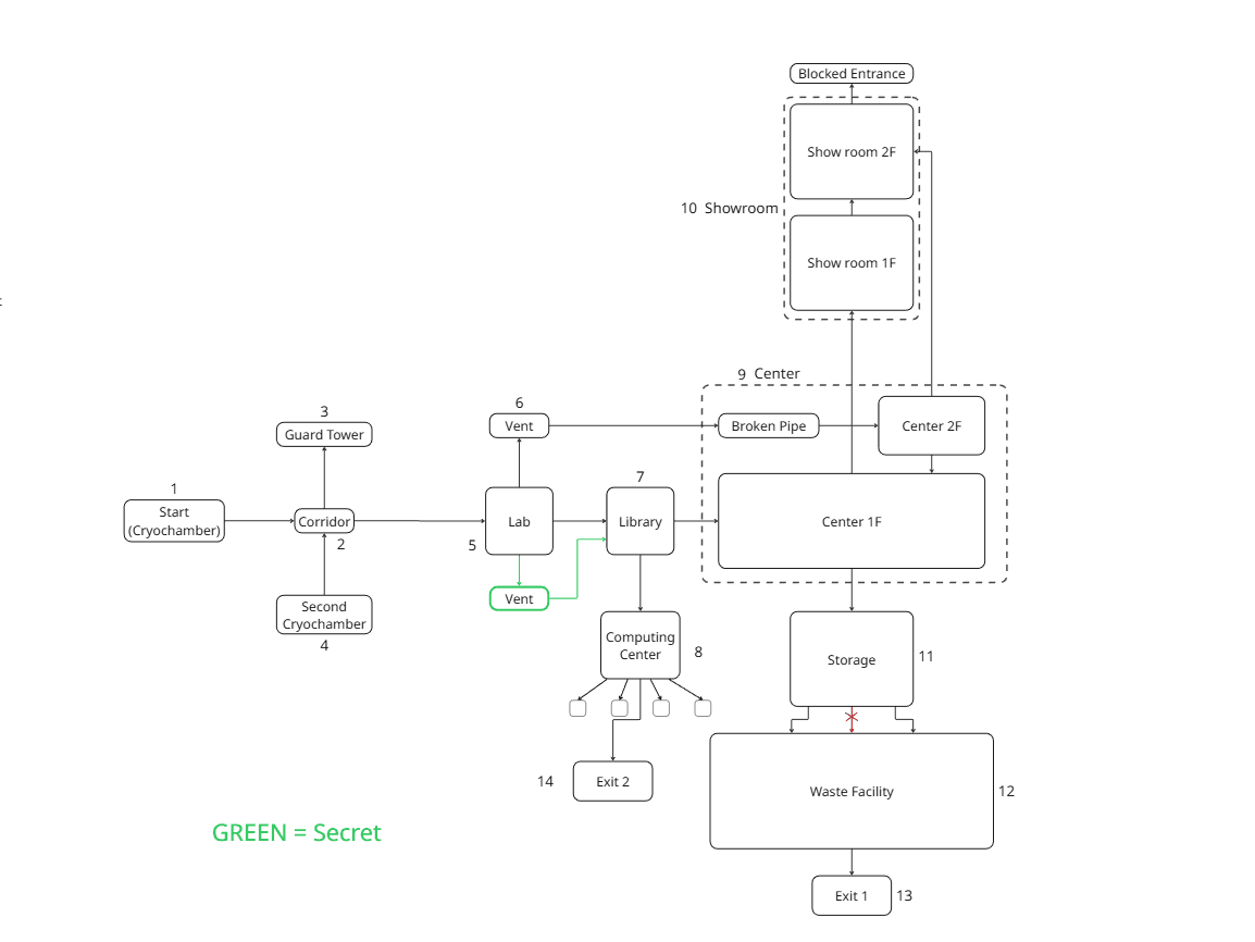 The level blockout was designed around clear spatial logic and player flow. Based on functional use and expected movement patterns, the research institute is divided into public areas (exhibition halls, lobby, library) and private areas (research labs, guard towers, storage, and mechanical spaces).