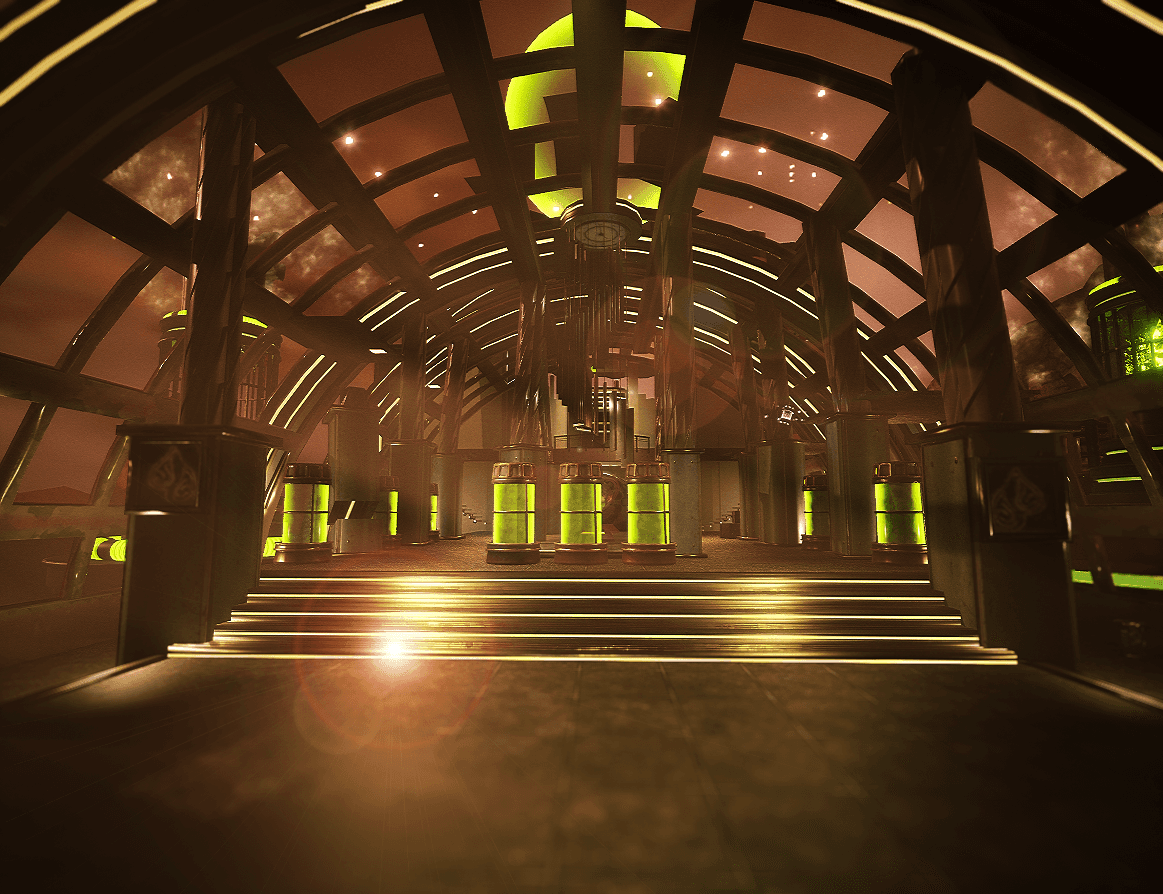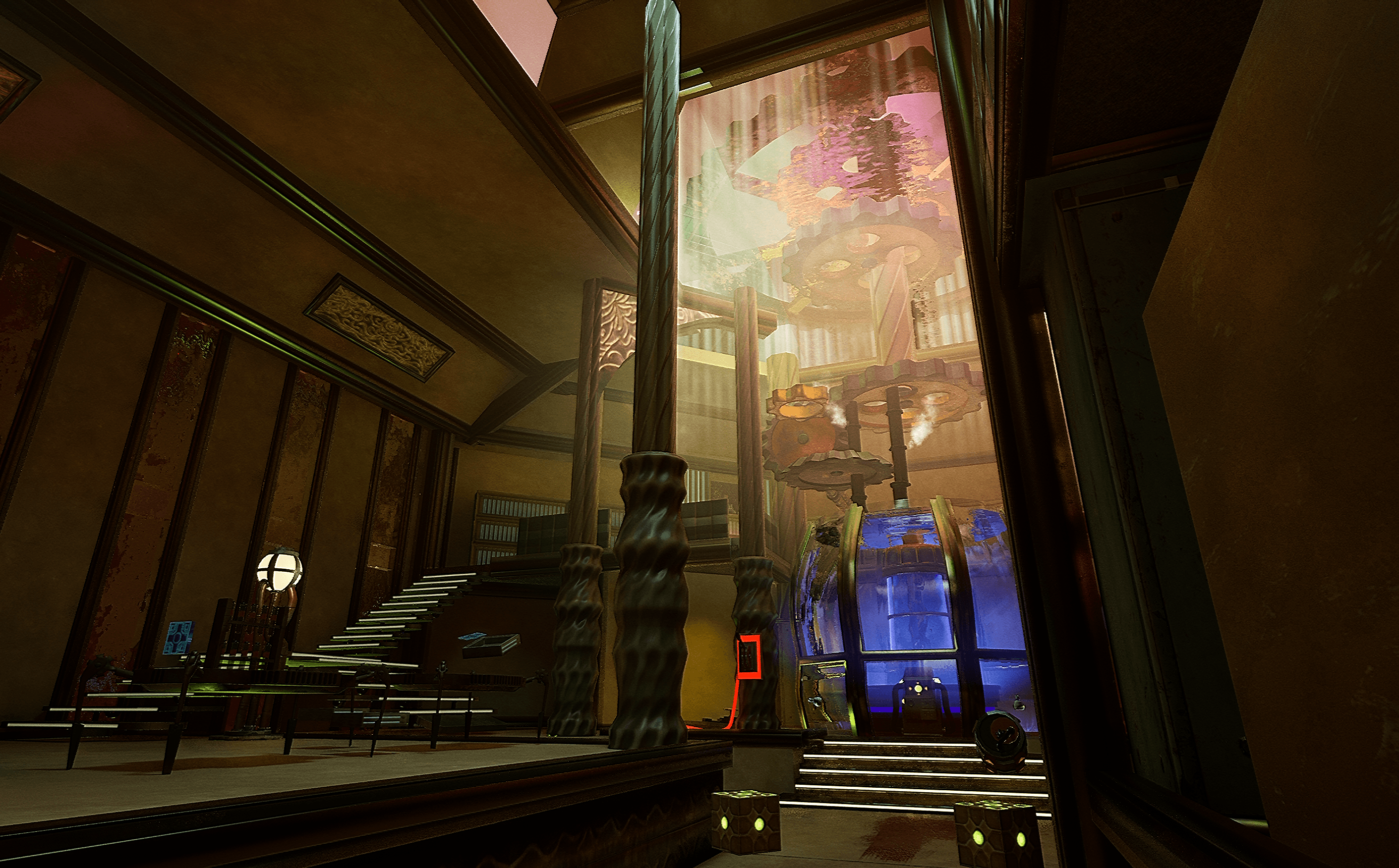 Architecturally, the level combines Victorian-inspired structures with alien and steampunk elements. Increased ceiling heights, exposed gears, and pipe systems reinforce the theme while maintaining readability for traversal, combat, and power usage.