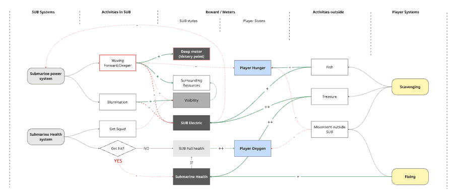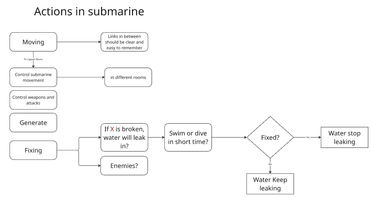 Identified what players do inside the sub, which rooms these actions relate to, and how quickly players need to react.Iterated the Layout