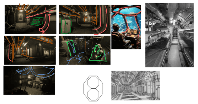 The submarine layout changed multiple times as our gameplay loop became clearer.