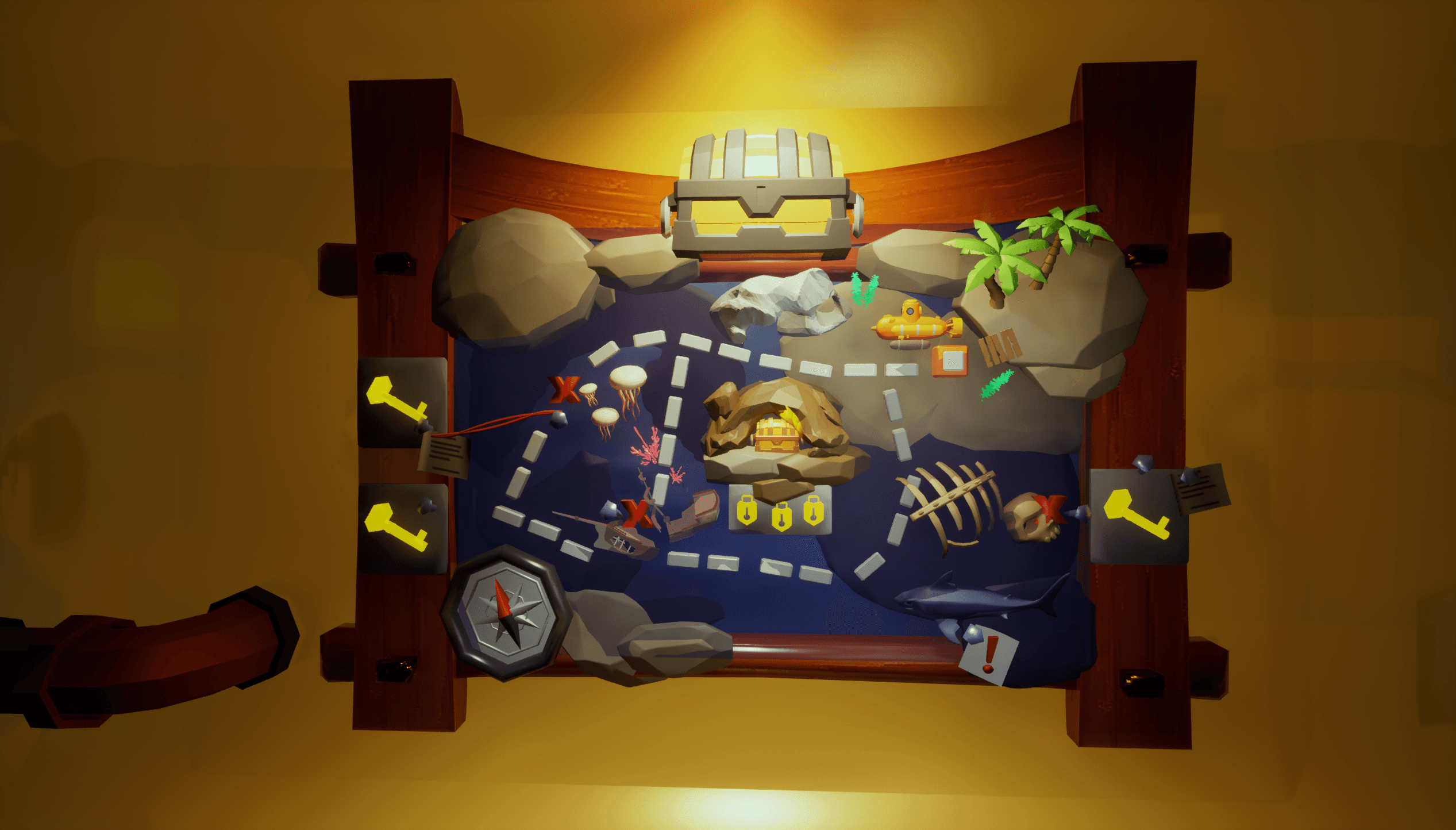 I also built a 3D treasure map to improve readability and created functional UI elements like a vertical depth compass and warning indicators to give players clearer, real-time feedback without breaking the submarine’s constrained visibility. try to change some thing and see
