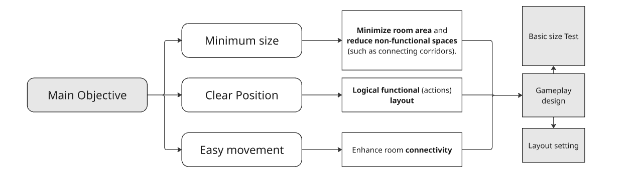 For the solutions, and that also explains why I forcused more on Gameplay loop at begining and make several space syntax diagrams. Using some relative knowledge will iterated and check if the spaces and connections works well in a theoretical way.